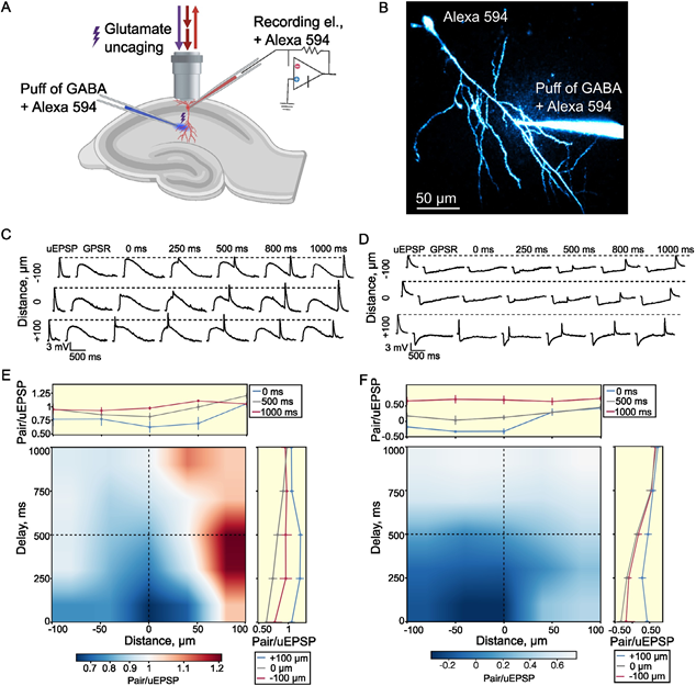 γ-氨基丁酸(GABA)是大脑中最主要的抑制性神经递质,传统观点认为其主要作用是抑制神经元活动。然而,近年来研究发现,在不同类型神经元以及不同生理状态下,GABA可能表现出去极化(兴奋性)或超极化(抑制性)的双重响应,这种功能多样性的具体机制尚不明确。本研究结合大鼠海马脑片电生理记录、双光子成像技术和生物物理建模,首次从实验和理论计算两个层面揭示了GABA在树突整合中的双重作用机制:具有去极化作用的GABA在突触处通过增强膜电导来抑制神经元,但在远端树突则通过激活电压依赖性的离子通道兴奋神经元,且这种兴奋效应持续时间更长;而具有超极化作用的GABA则在所有时空条件下均表现为抑制作用;不同类型的神经元(如CA1锥体神经元与齿状回颗粒细胞)对GABA的响应存在显著差异,表明神经元自身特性决定了GABA的功能输出;本研究还提出了“途中抑制”(enroute inhibition)的新概念,即一个兴奋信号在向胞体传递的途中,若经过一个被GABA激活的树突区段,其强度会被局部削弱,这为理解树突如何精细微调信息流提供了新视角。这项研究首次系统揭示了GABA在大脑神经元树突整合过程中表现出的复杂时空动态机制。从根本上更新了我们对GABA能信号传递的认识,将其从一个简单的抑制性开关,提升为一个具有丰富时空动态的精密调节系统。这一发现不仅深化了我们对大脑基础计算原理的理解,也为与神经环路兴奋/抑制失衡相关疾病(如癫痫、阿尔茨海默病等)的机制研究与治疗提供了新的策略和理论依据。